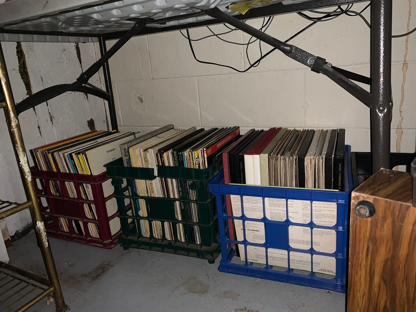 Adding a thousand or so classical LPs wasn’t gonna go easily on my full shelves, so I did some condensing and sorting. I zeroed in on an area in the War Room, a space where I typically won’t keep sale inventory. Under one bay of tables, where my Commodore Vic 20 and Apple II setups reside, there was a mishmash of empty totes, catch-all milk crates and boxes. I pulled all that out, repurposed the crates for vinyl, and got something like 500 records neatly stashed in a dry, climate-controlled spot for later listing.