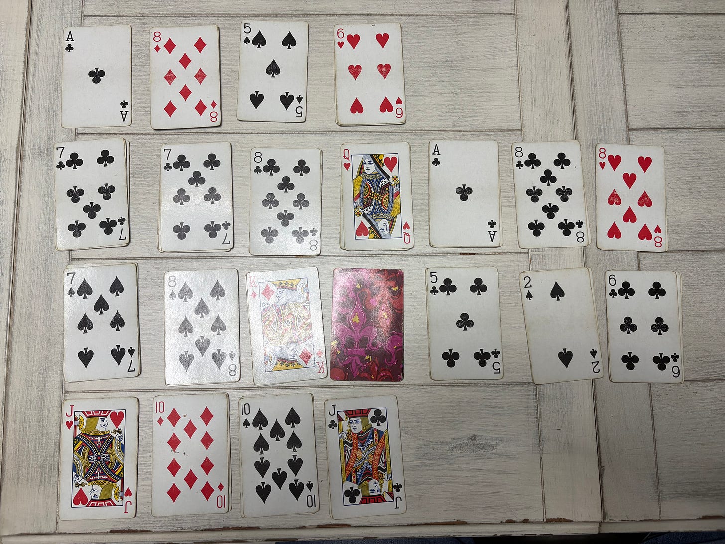 You make thirteen piles, each corresponding to a card value, with aces low. Lay the cards out into two rows, one two three four. The center space in the second row is your draw pile. Put that card face down, then do jack queen king, then go back to ace and lay down another layer. Any time the face-up card corresponds with the spot it’s in – a two in the two spot, a jack in the 11th box – drop the next card face down into the draw pile. An ace also earns you a draw card. An ace in the ace spot? Two draw cards in a row.
