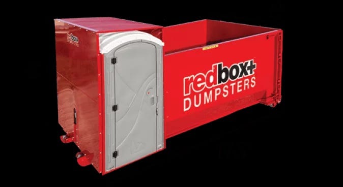There’s a house undergoing renovation a couple blocks over, and for at least a month now, they’ve had the most novel innovation parked in their driveway. I don’t know if this particular company is the first to attach a Port-a-jon to their dumpsters, or the only ones, but I guess if you’re not gonna be home while people are working on your house, it solves a lot of problems.